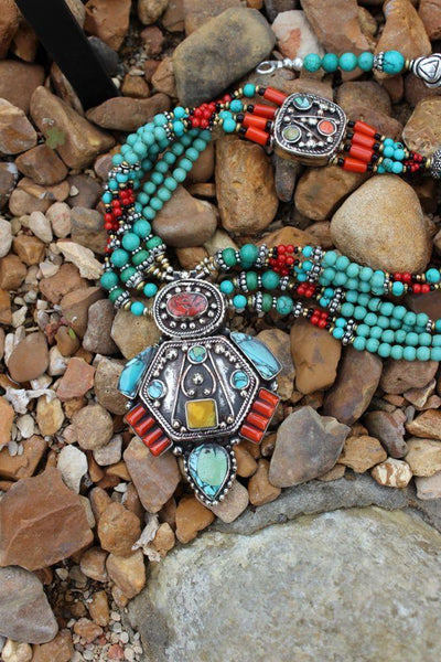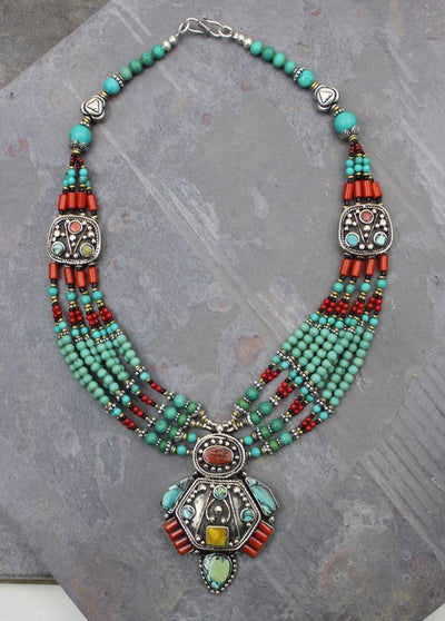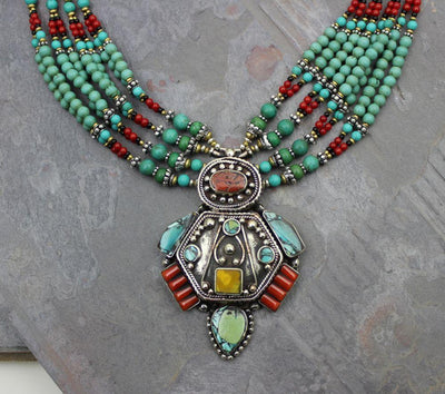 This beautiful and colorful necklace features a main focal bead contains coral, copal, and turquoise inlay. Strung together with eight strands of pressed turquoise and silver plated brass beads.