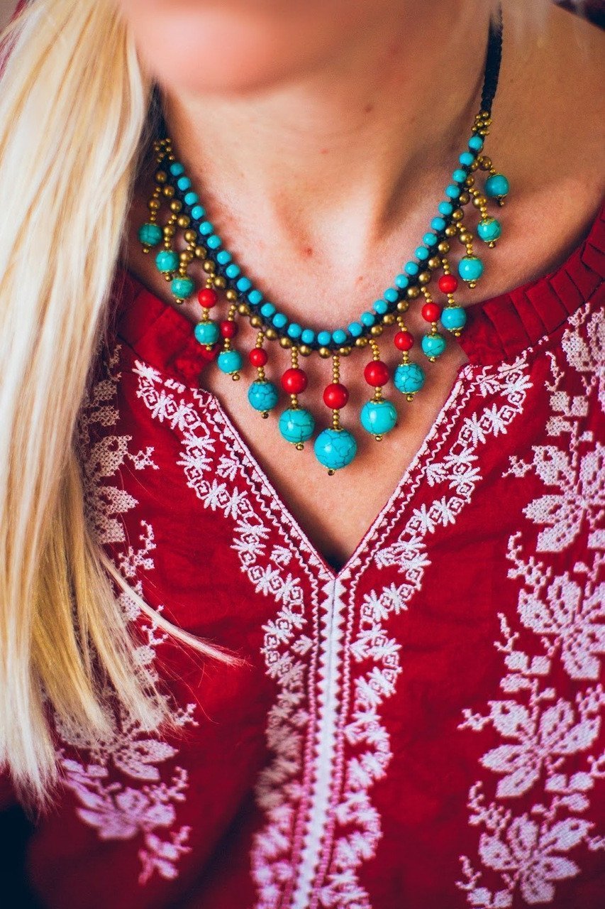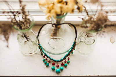 We love these new necklaces from India, handmade in a Tibetan community! Brass, pressed turquoise and colored coral beads dangle from this unique hand knotted cotton necklace.