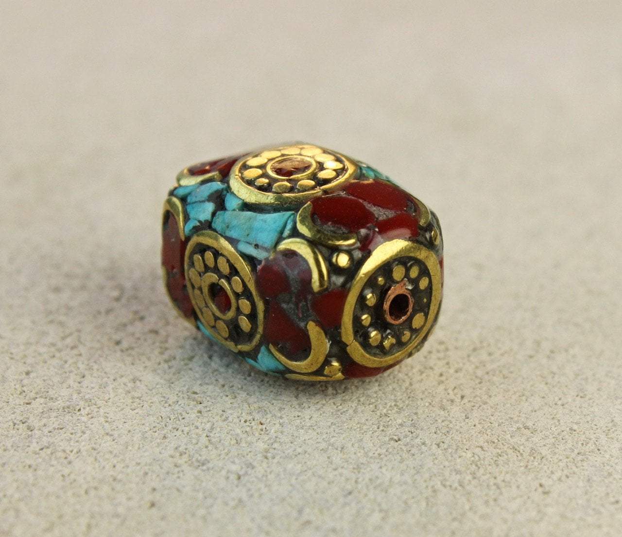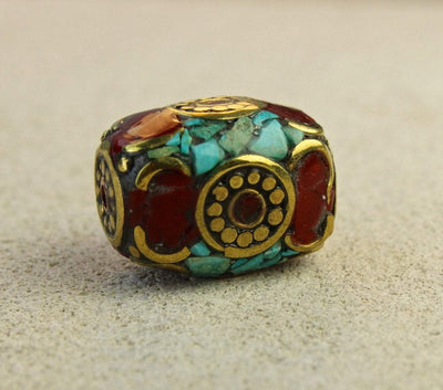 High quality traditional Tibetan bead with brass and inlaid turquoise and coral. Would be a nice addition to any mala, bracelet or necklace.
