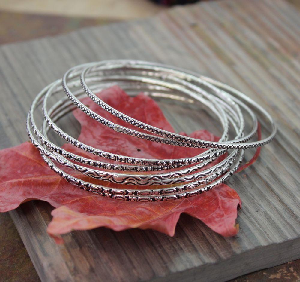 8 thin hand stamped bracelets to wear as a set. These bracelets are made from 60% white copper and 40% zinc. They have the look and feel of sterling silver at a fraction of the cost.