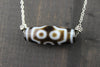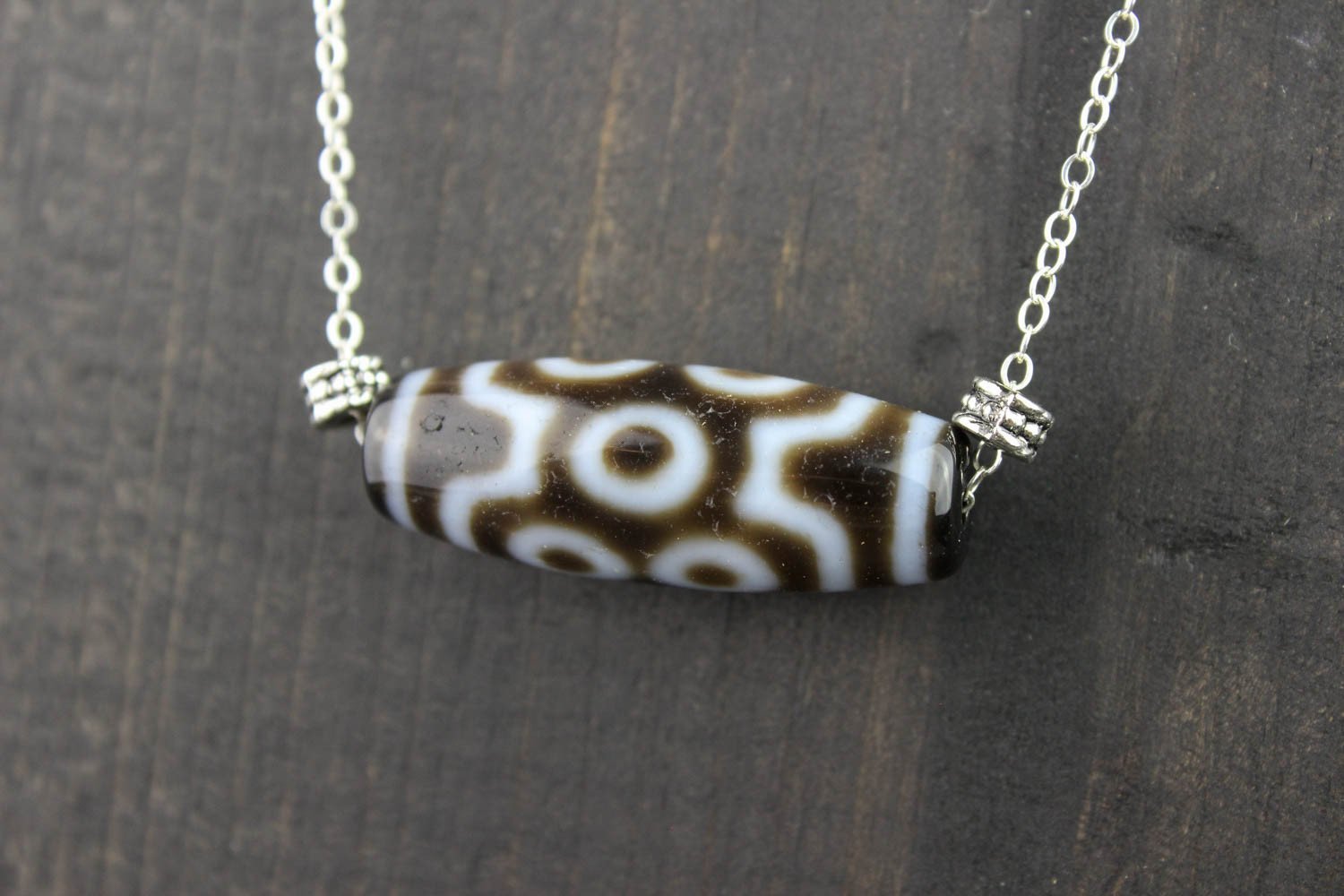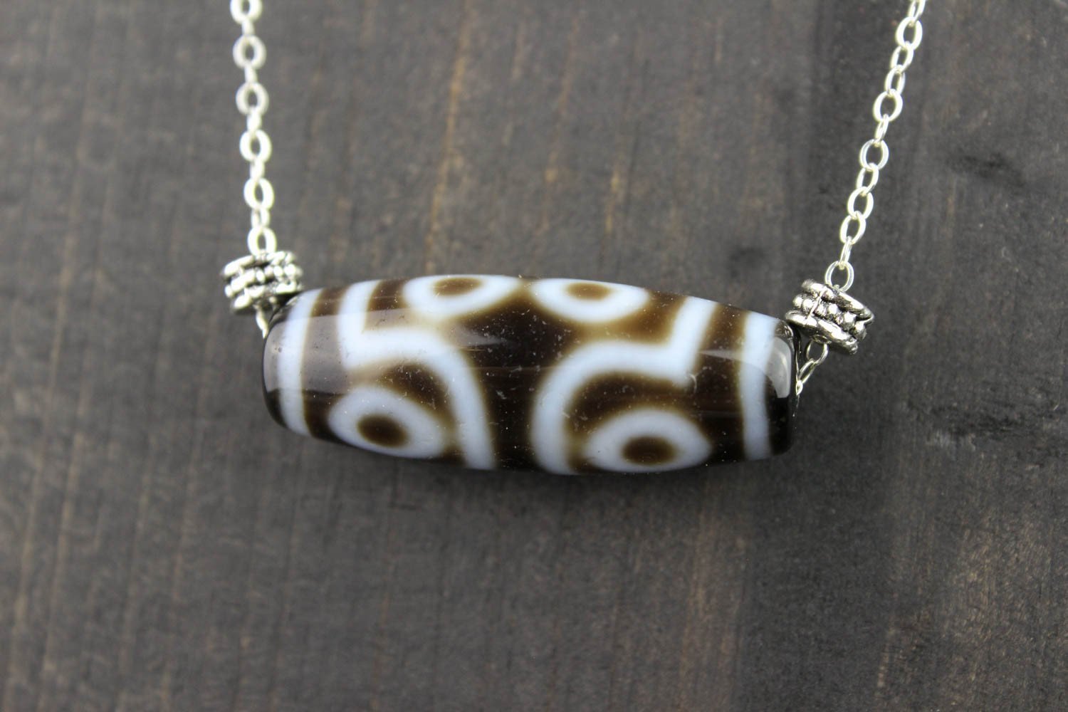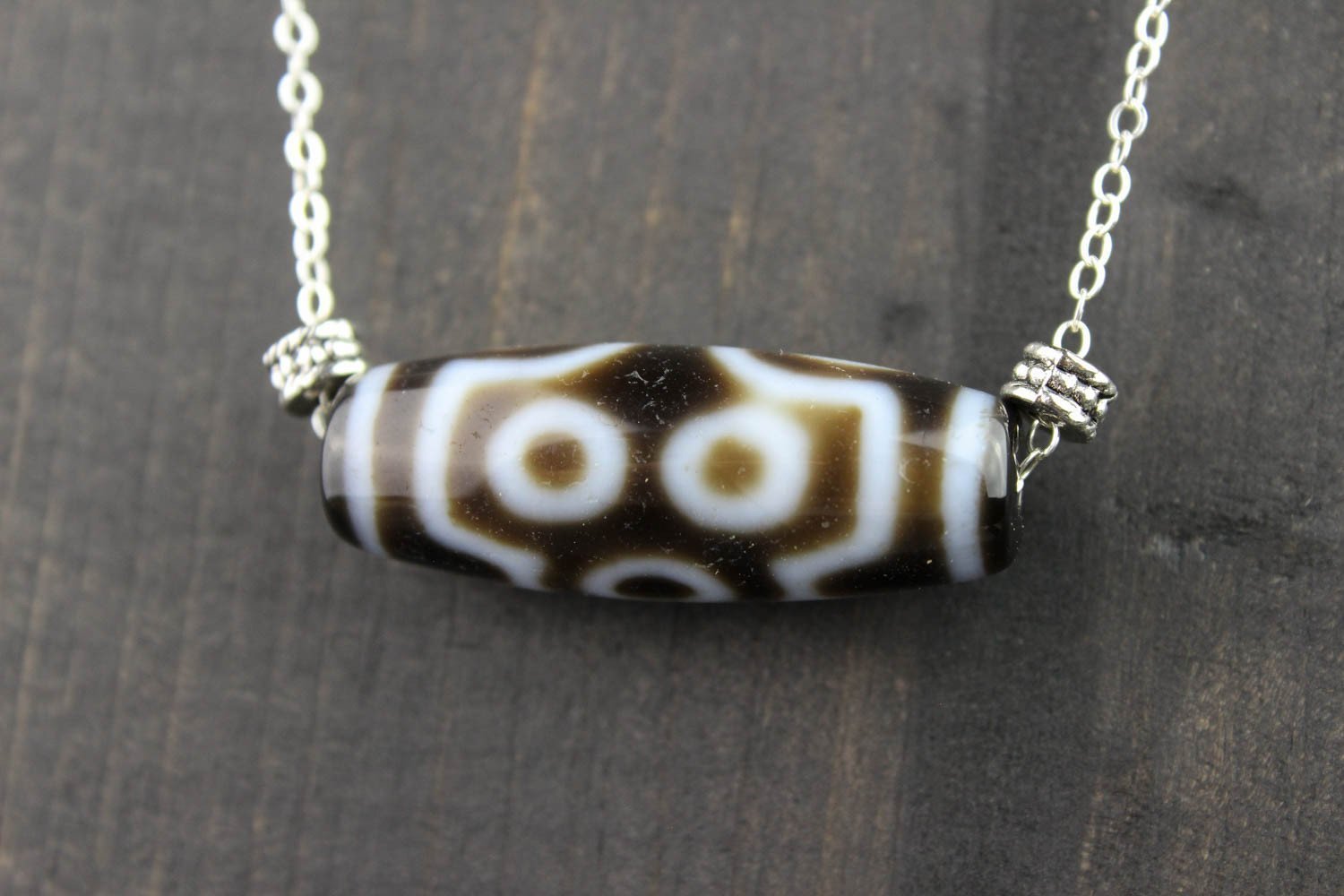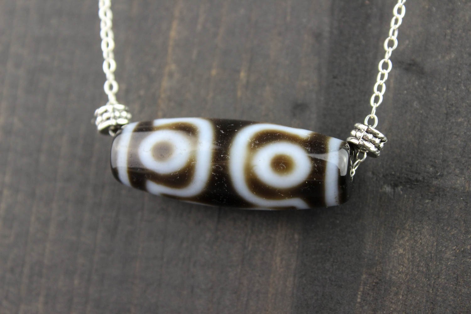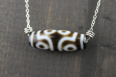 A beautiful and unique true agate 7 eye Dzi bead hand strung on a sterling silver necklace. The 7 eye Dzi aids the wearer in achieving perfection in every aspect of life: good fate, good name, career, fortune, health, long life and marriage. It also