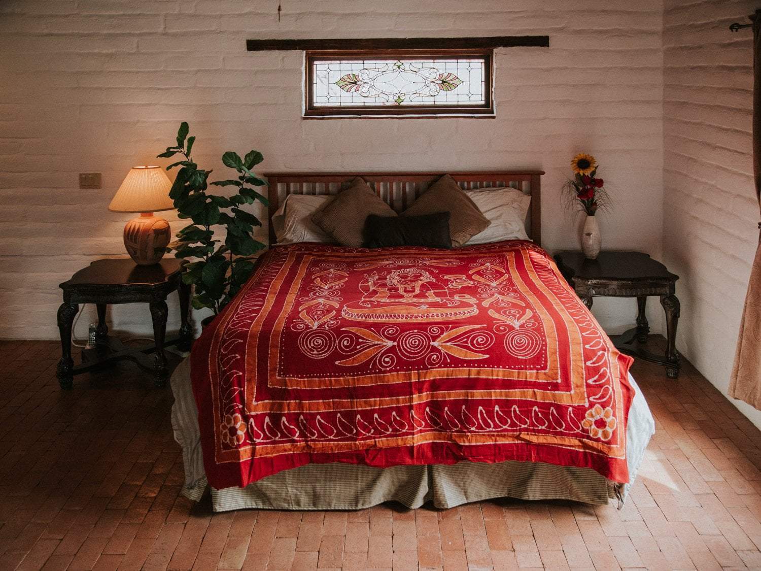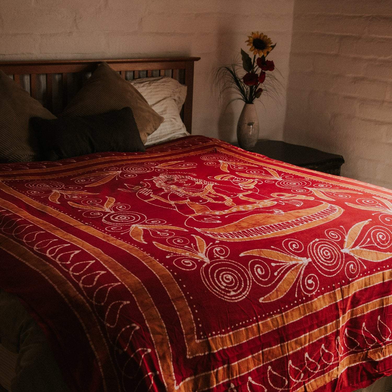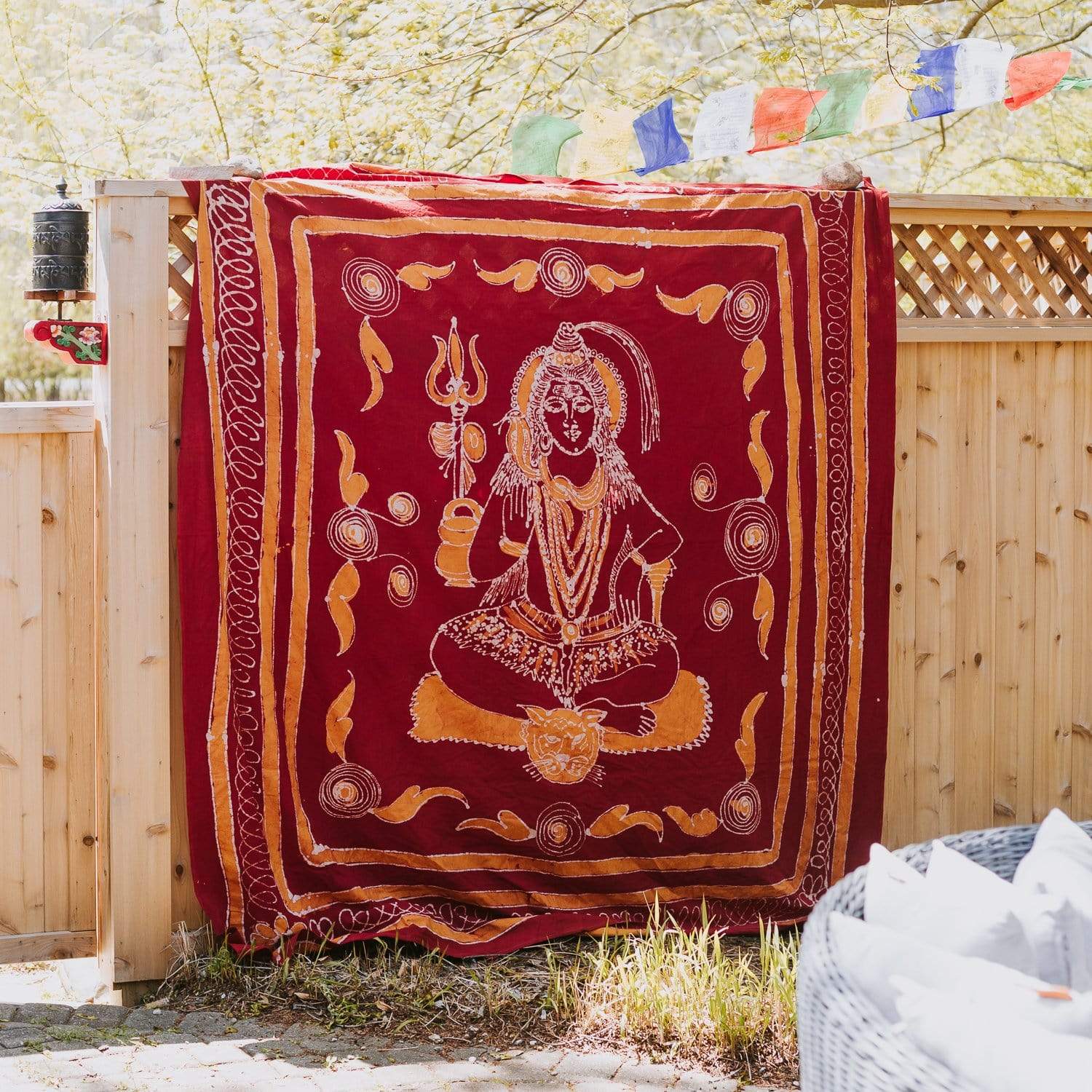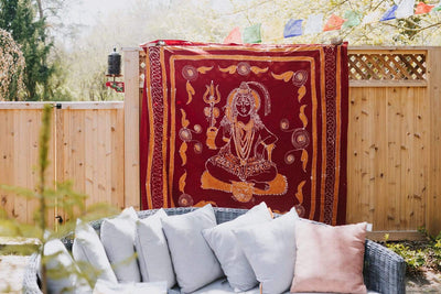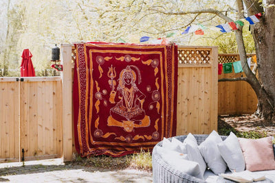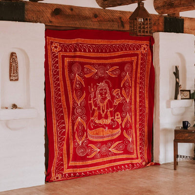 The beautiful design includes an image of Shiva, the deity who creates, protects, and transforms the universe. Due to the hand dyed color process, each tapestry is unique and the design may vary slightly with each batch made.