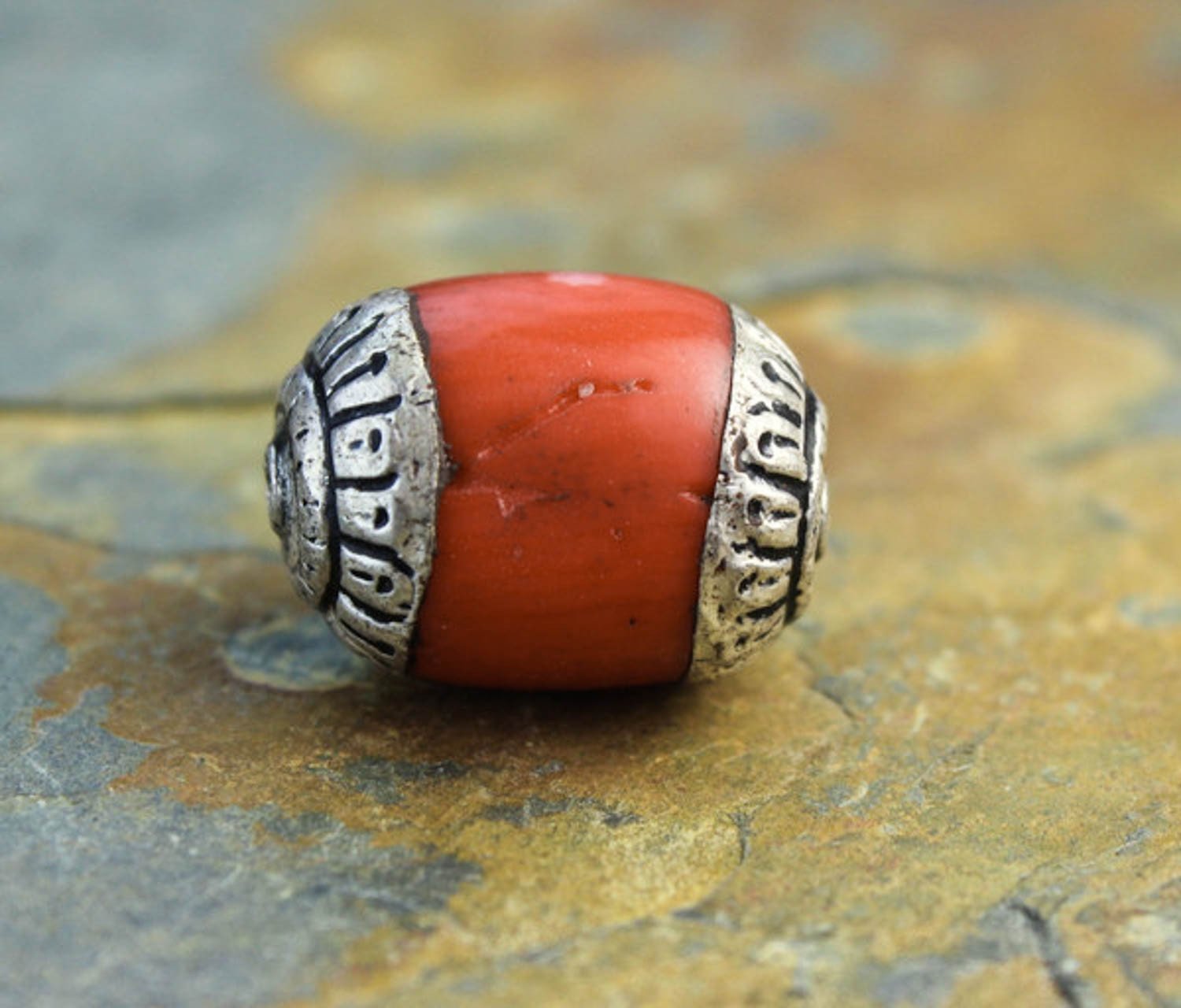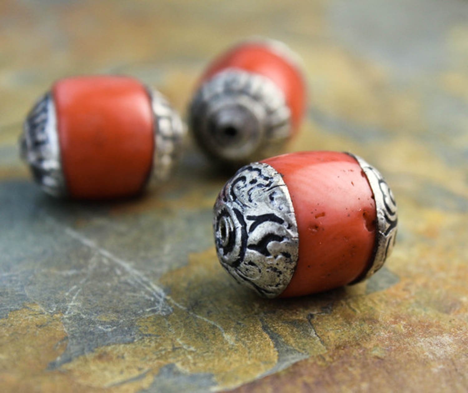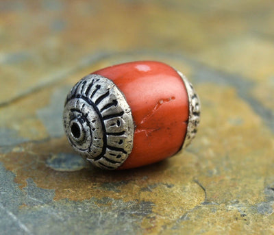 Rustic silver capped antique coral beads. We only brought a few of these back from our last trip. Would work great as a focal bead or spacer on a mala!