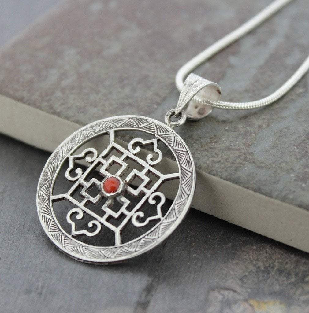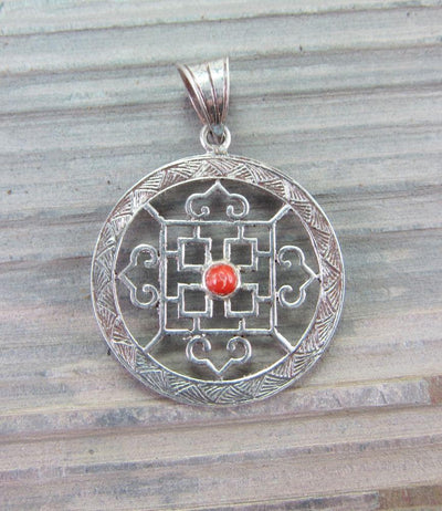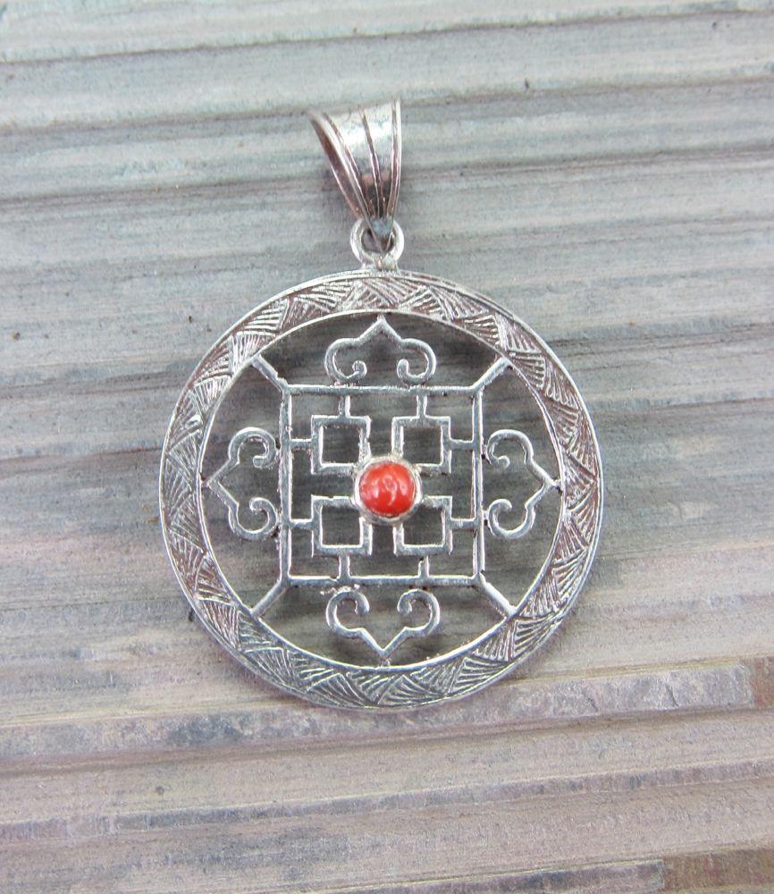This gorgeous silver mandala pendant has a center coral bead. The term is of Hindu origin and appears in the Rig Veda as the name of the sections of the work, but is also used in other Indian religions, particularly Buddhism. In the Tibetan branch of Vajrayana Buddhism, mandalas have been developed into sandpainting. They are also a key part of anuttarayoga tantra meditation practices. In various spiritual traditions, mandalas may be employed for focusing attention of aspirants and adepts, as a spiritual teaching tool, for establishing a sacred space, and as an aid to meditation and trance induction.