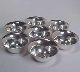 The traditional set of offerings, commonly represented by bowls of water, derives from the customary offerings presented to an honoured guest in ancient India. The first second and sixth bowl have water offerings, while other bowls contain Incense,flowers and a conch shell to symbolize music. Made in Nepal.