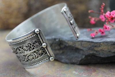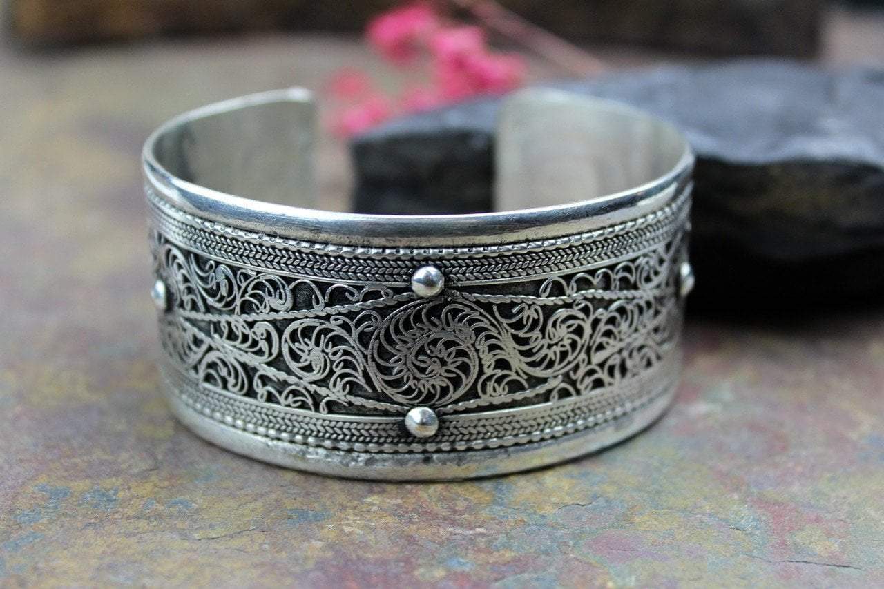 Adjustable, silver plated filigree cuff style bracelet. Remarkable detail!