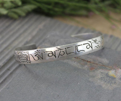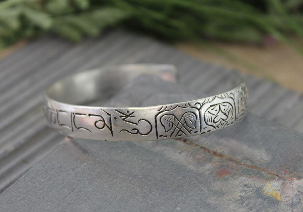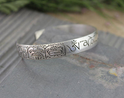 This handmade bracelet is so cool! Silver plated and hand carved so each one is unique. Features the mantra of compassion, Om Mani Padme Hum, along with the 8 Auspicious Symbols.