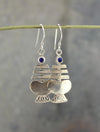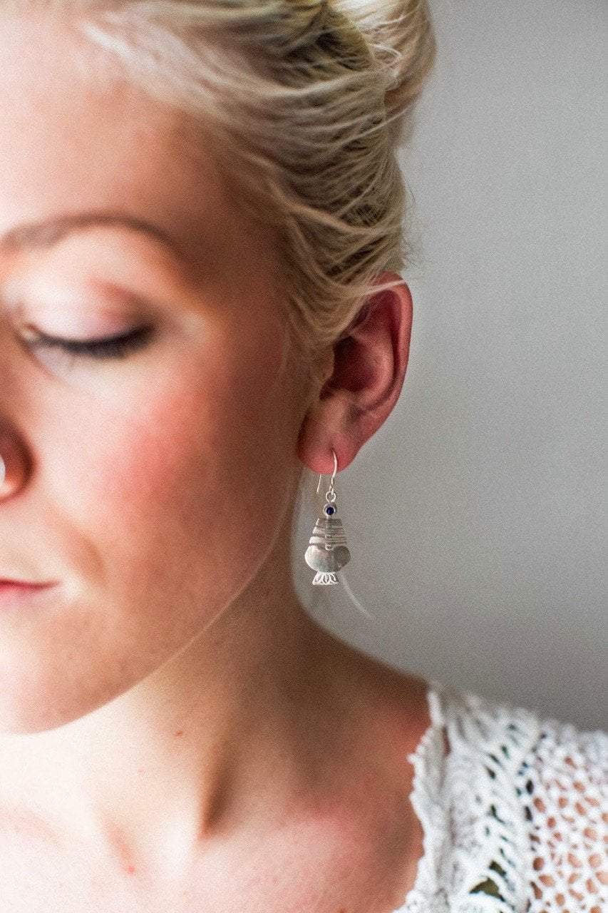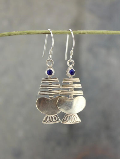 The reflective, symboloic stupas in miniature. Capped with a small lapis bead. Made in Nepal. Sterling silver.