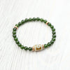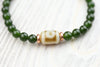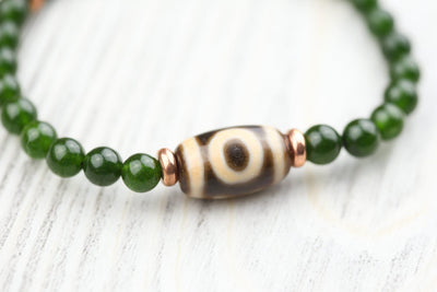 • A DharmaShop exclusive design, this bracelet features bold Green Jade beads with a true agate Dzi bead centerpiece and copper spacers.