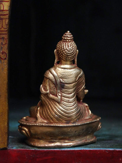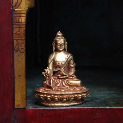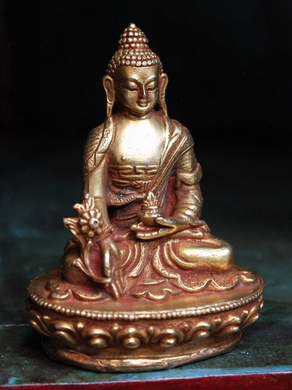 This small Medicine Buddha statue is made of bronze and is entirely 14K gold plated.  It is the perfect size for your altar, bookcase, or desk.  Features the meditating Medicine Buddha sitting upon a lotus platform with beautiful detail.  The bottom of the statue is hollow for consecration.