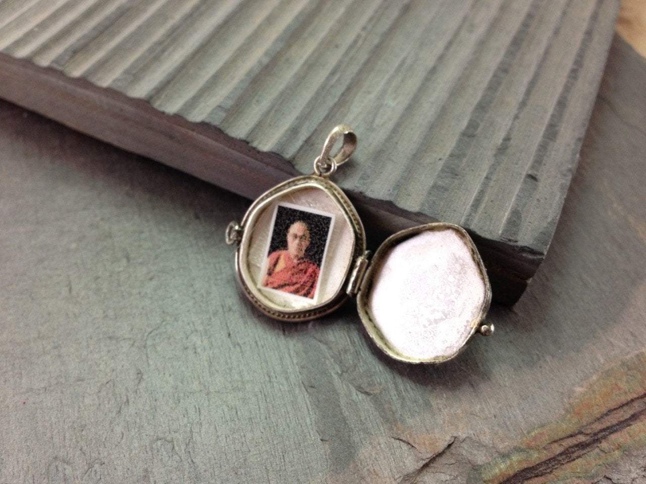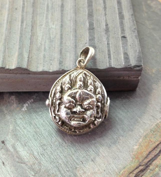 Fierce protectorate in gau form. The gau is a Tibetan locket used to hold a small picture or relic. We ship yours with an image of His Hoiiness and a bit of kata. Sterling silver. Made in Nepal.