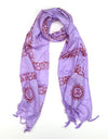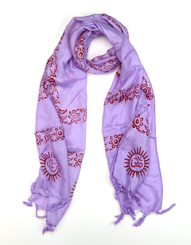 These popular Om design prayer scarves are a bit smaller and have hand tied fringe for a more finished and sophisticated look. Beautiful lavender color and extremely soft.