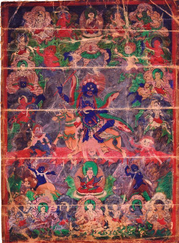 I have had this thangka fragment in my collection for 12 years. It came to me in this very tattered shape from a Tibetan woman in Nepal. I have always felt connected to the wrathful deity that protects the dalai lama.