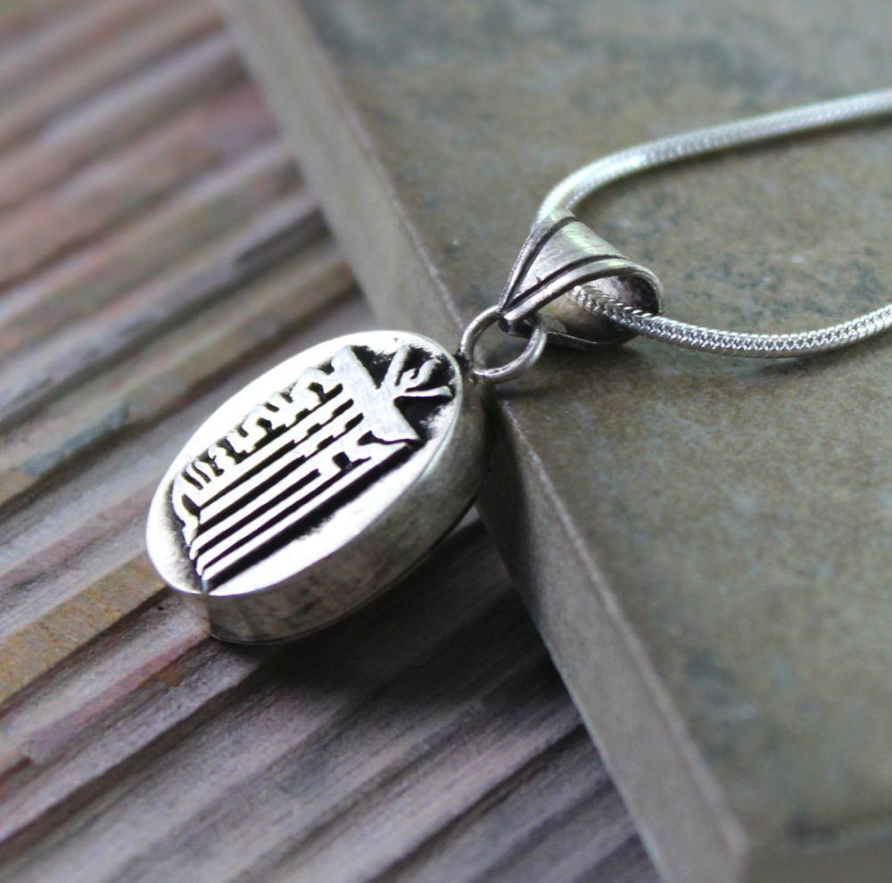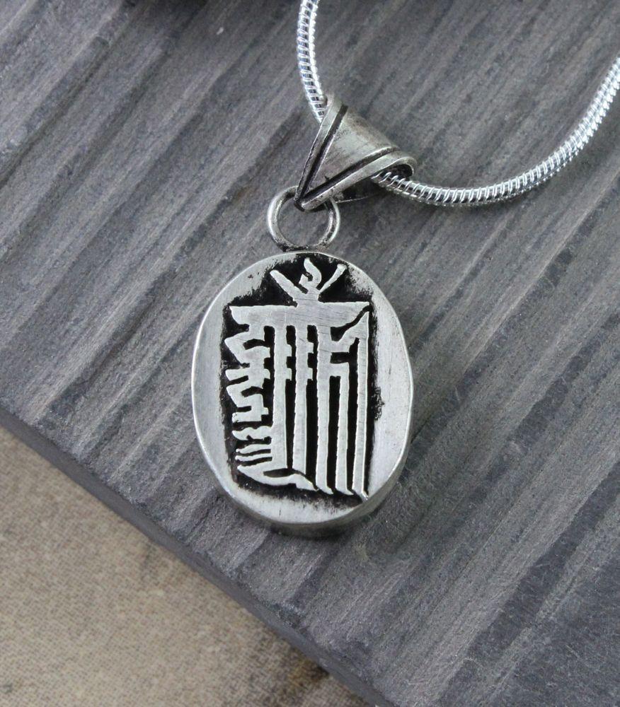 A solid sterling silver amulet box (gau) with the Kalichakra symbol on the outside.