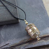 A very special sterling silver hand carved Om Mani prayer wheelpendant made of solid silver with gold accents.