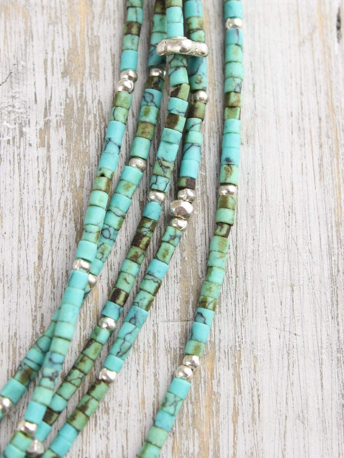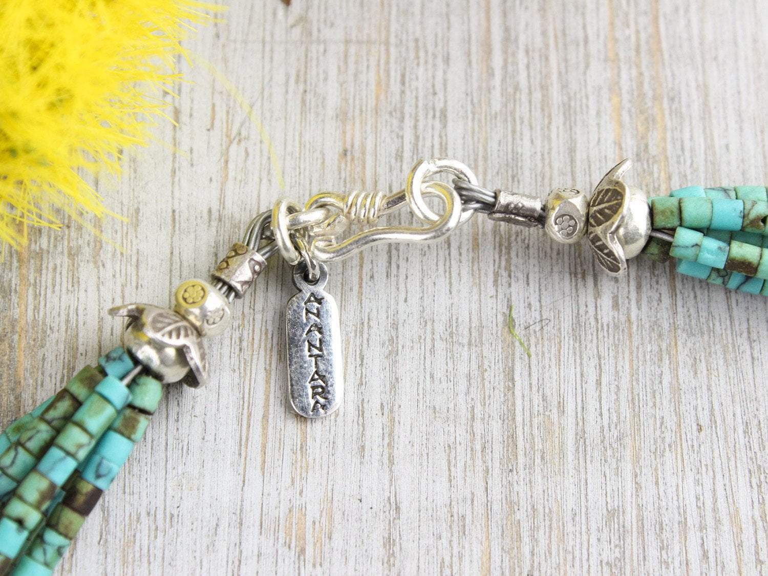 Five strands of tiny turquoise beads with 98% pure Hill Tribe silver elements cascade to create this beautiful necklace. Hand stamped floral elements decorate the closure.