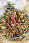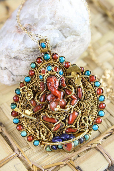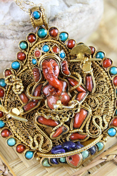 Exceptionally detailed, one-of-a-kind Thai Vermeil pendant that is handmade by our artists in Nepal. Pendant features a hand carved coral Ganesh and is garnished with turquoise, lapis, and other coral accents. Absolutely no detail was spared when making this piece and it certainly does not go unnoticed. Hand stamped traditional Thai symbols are included on the back of the pendant.