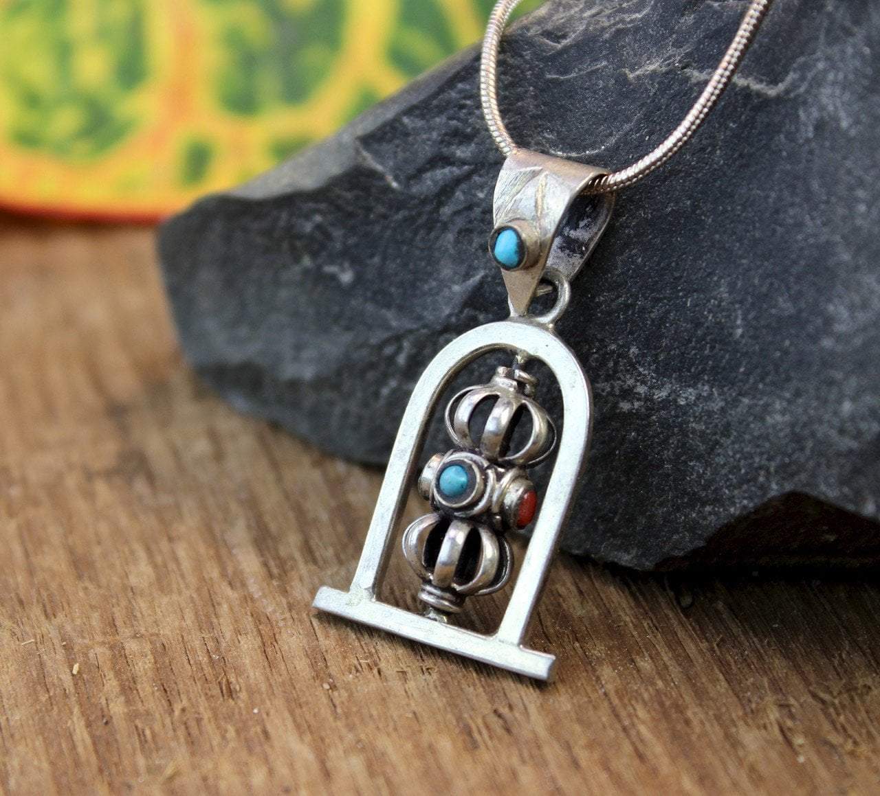 Silver plated spinning dorje pendant with turquoise and coral inlaid stones. A simple design with a pop of color.