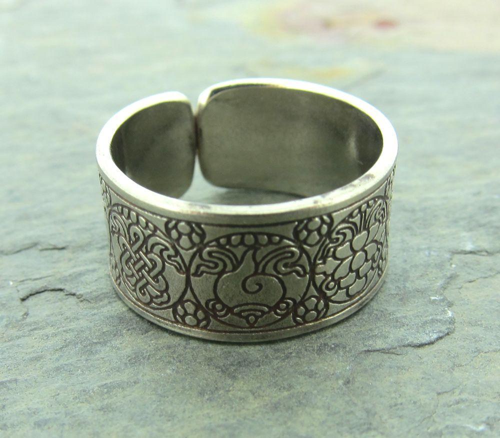 Handmade in Nepal. These wide rings are sort of adjustable. They are a bit tough to open but if you have a 9 through 11 size ring finger, this will stretch to fit quite nicely.