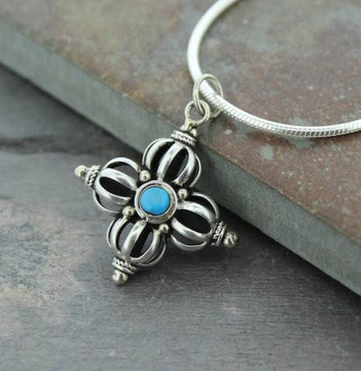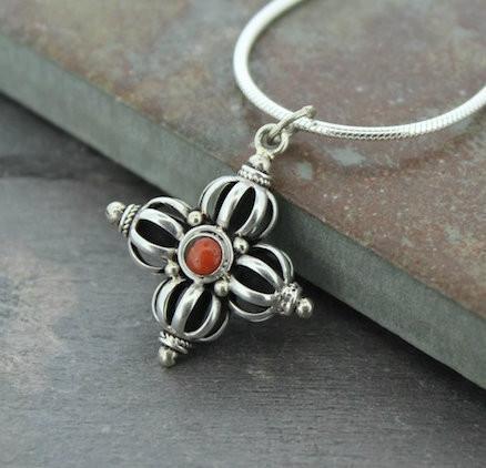 A stunning double dorje design with a turquoise stone on one side and a coral stone on the other.
