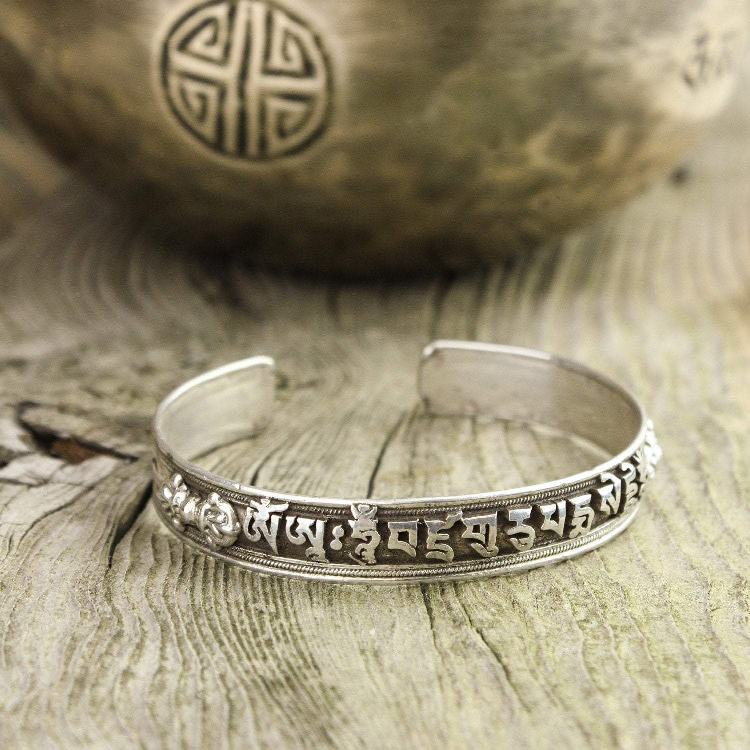 This fully adjustable, solid .925 sterling silver bracelet with is made in Nepal and features the Padmasambhava mantra, 'Om Ah Hum Vajra Guru Padma Siddhi Hum' in Tibetan script. This mantra, also known as the Vajra Guru Mantra, is the very heart essence of Padmasambhava. When you chant it, you are invoking the very embodiment of Padmasambhava.
