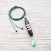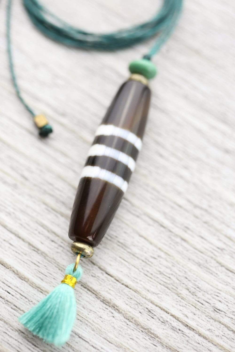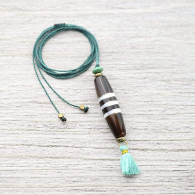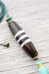 • We had our jewelry specialist string this unique true agate 3-stripe Dzi bead on turquoise cord with a matching tassel and accent bead.  It features a sliding knot for adjustable length.