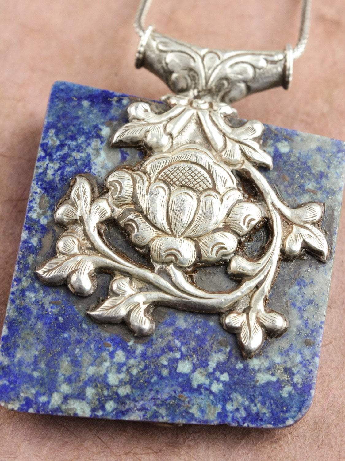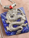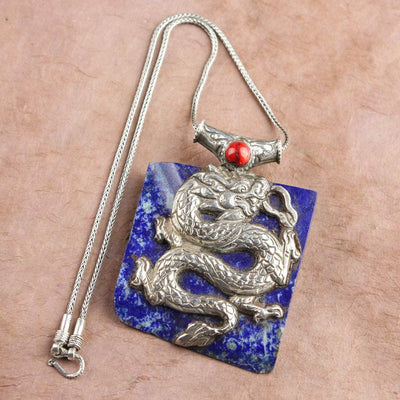 This stunning, one-of-a-kind statement necklace features a stunning natural lapis pendant with a true coral accent. Exquisite sterling silver details decorate the pendant. The front side displays an intricately hand carved dragon and the back features a beautifully etched lotus design.