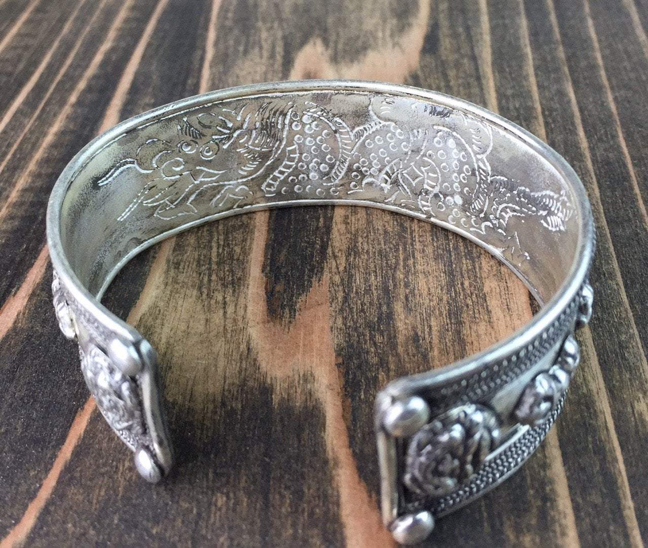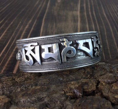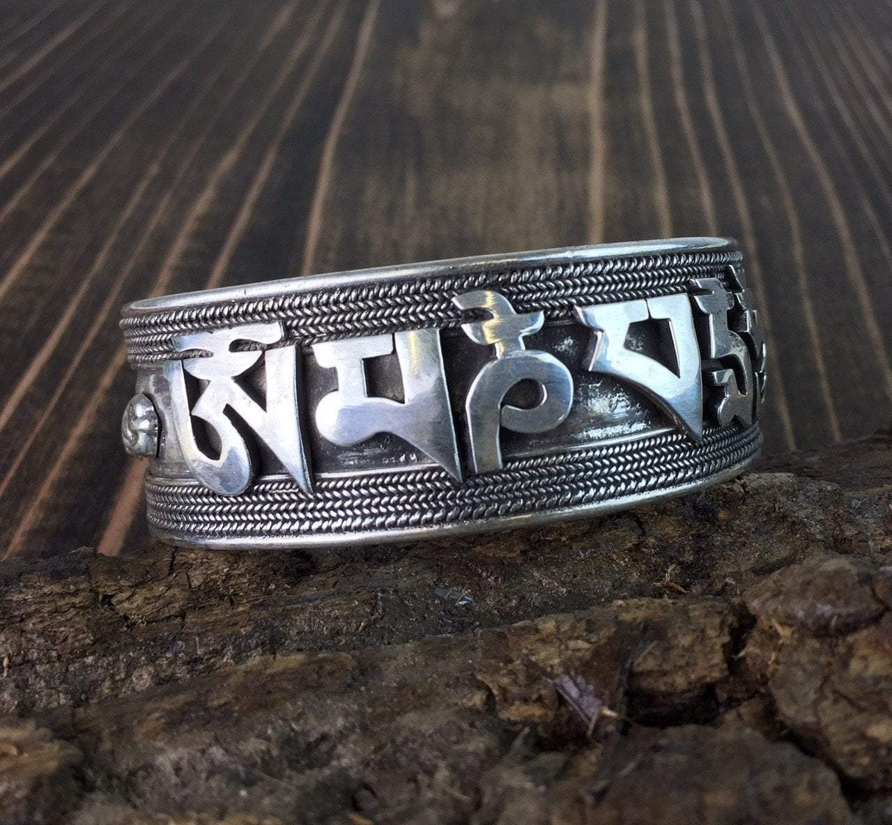 We have been using the same artisan group for over 12 years to make these stunning solid silver bracelets. Beautifully carved details and inlays. The script 'Om Mani Padme Hung' loosly translates to Hail to the Jewel in the Lotus, a prayer for compassion.
