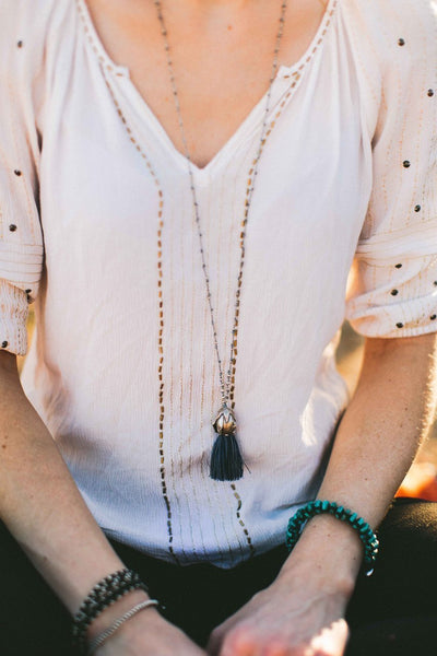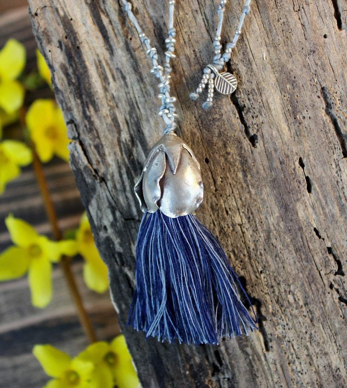 This necklace features a sterling silver flower that hangs delicately at the bottom of a hand woven chain with silver accent beads.  Nylon cord is a light blue color.  Navy and light blue silk tassel graciously drops from the flower.  A beautifully hand crafted masterpiece.  100% hand made in Nepal.