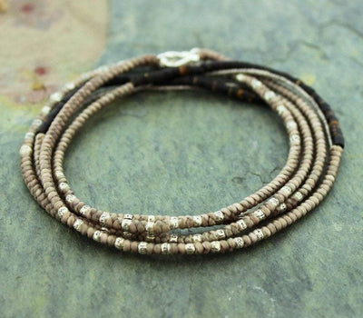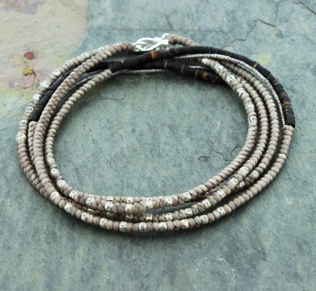 Our new handmade wrap bracelet can be used as a necklace as well. 1 30 inch strand of sterling silver, coconut shell beads and hill tribe silver spacer with a hook closure. You can add a charm or pendant, and wear it as a necklace or just wrap it 4-5 times around your wrist. My new favorite!