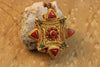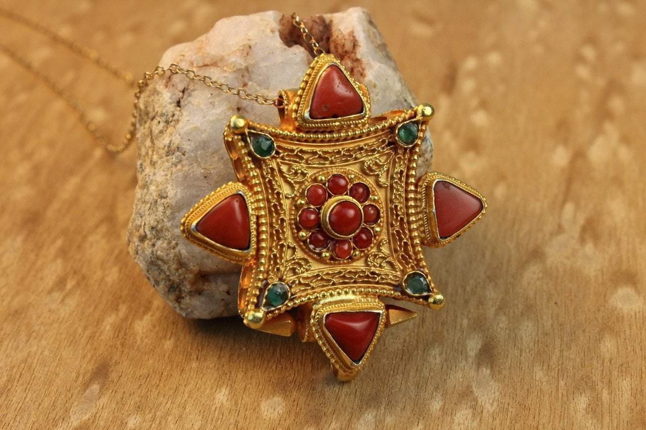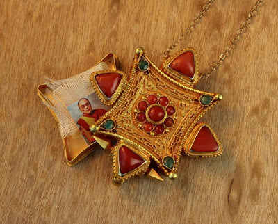 A very special Tibetan gau. Tantrika means 'special' in Sanskrit; and this gau is just that. Hand carved slid .925 sterling silver plated with 24k gold and set with coral and aventurine stones. Four large coral triangle stones on each side. The back opens to reveal an image of HH the Dalai Lama and a piece of prayer cloth (kata).