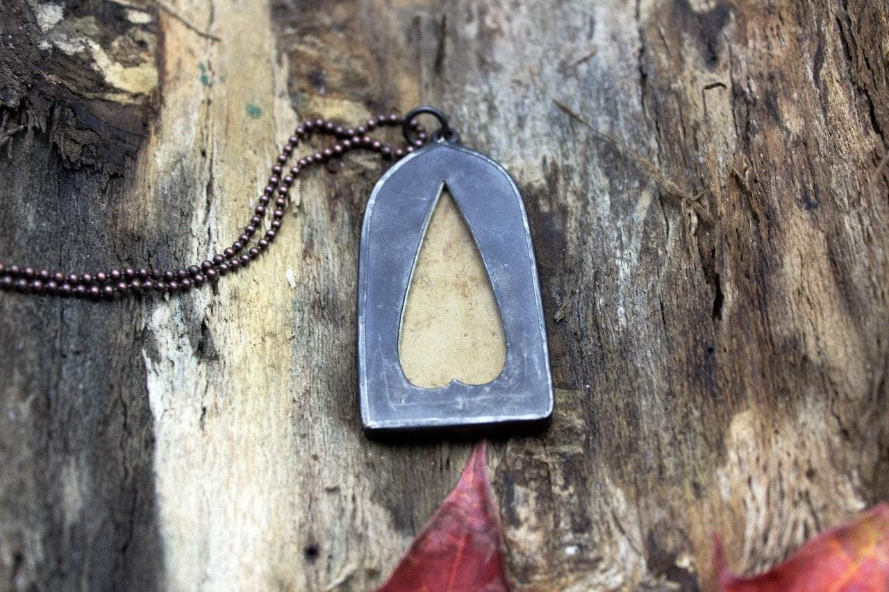 Hangs on a 24 inch copper ball chain. Amulet measures 2 1/4 inches by 1 inch.
