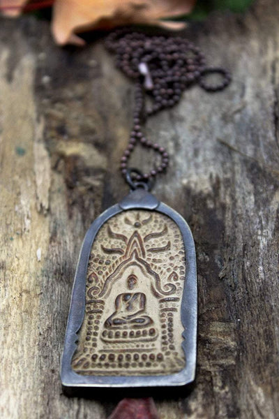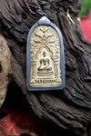 This large, peaceful Thai Buddha amulet is made of hand pressed clay by monks and encased in metal.