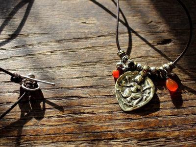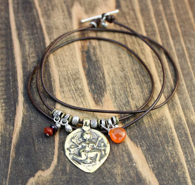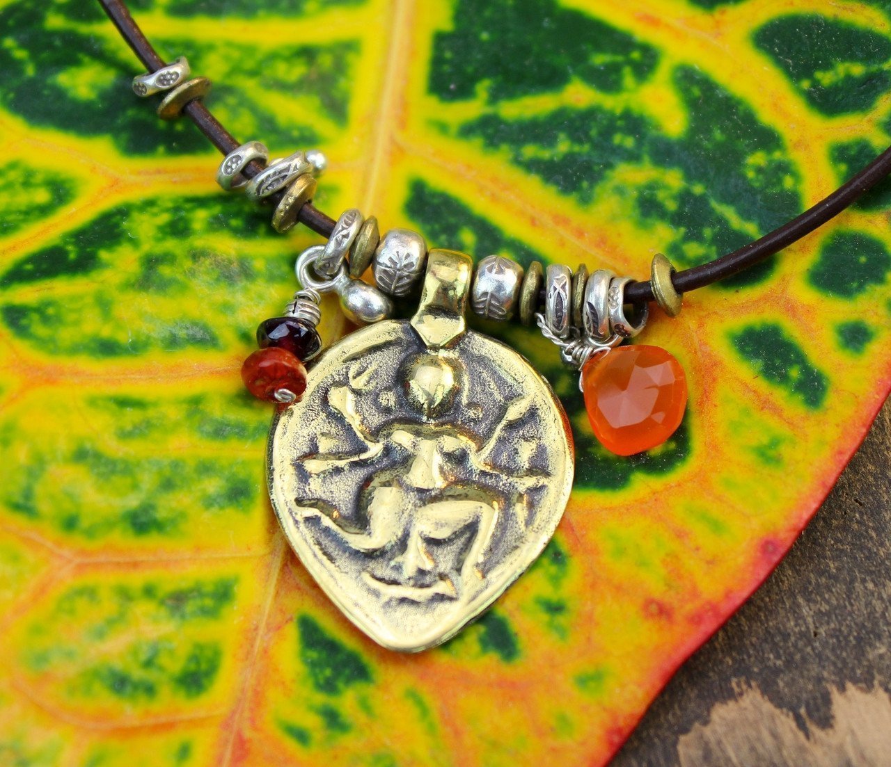 Extremely unique Thai deity necklace! Silver charms with colored accent charms and a brass focal bead are strung on brown leather cord. Closure features a metal bar through a metal hole for a secure closure.