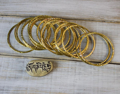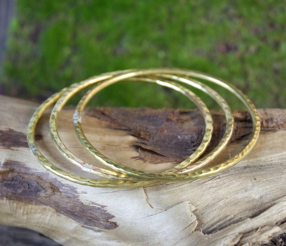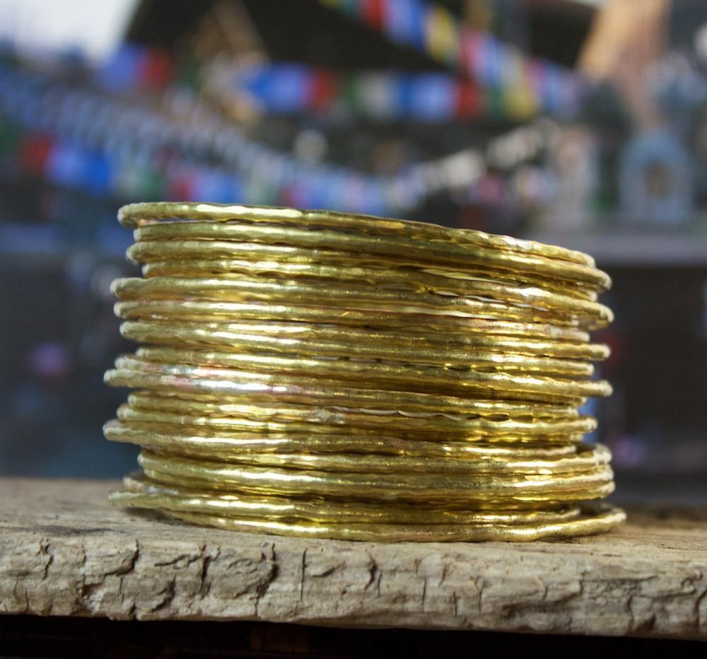 Brand new from Thailand. Hand hammered brass bangles sold individually. Pictured on model with 5 bangles, these are great to stack!