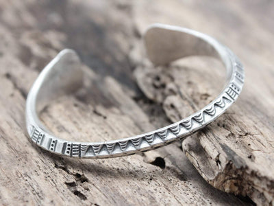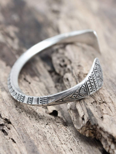 Make a statement with this classic Hill Tribe silver cuff bracelet.  Bold circles, arrows, and geometric designs decorate this open front cuff.  With a higher silver content than sterling, this handmade Thai silver bracelet has a radiant shine that rarely ever needs to be polished.