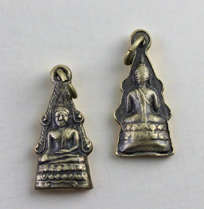 Every year on our way to Nepal we stop in Thailand to rest, relax and shop for Buddha amulets and pendants. This 1 inch tall brass Thai Buddha is hand cast and blesed by monks outside of Wat Arun in bangkok.
