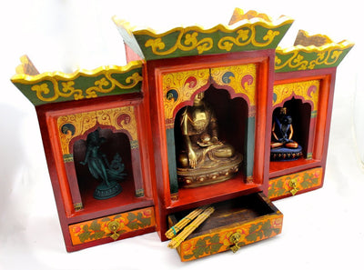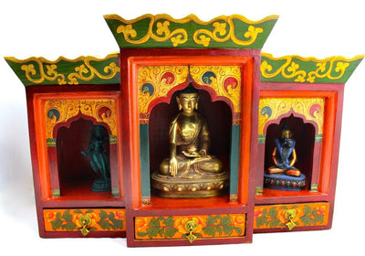 This three compartment altar box is made in Nepal and can accommodate two, 5 inch statues on the sides and a statue as large as 7 inches in the middle. Hand carved and handpainted with a drawer under each compartment. Price includes shipping in the USA. (statues not included)