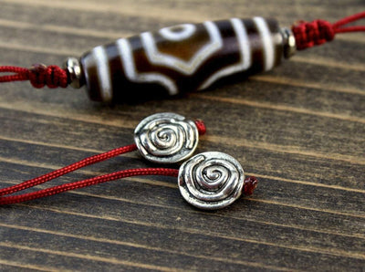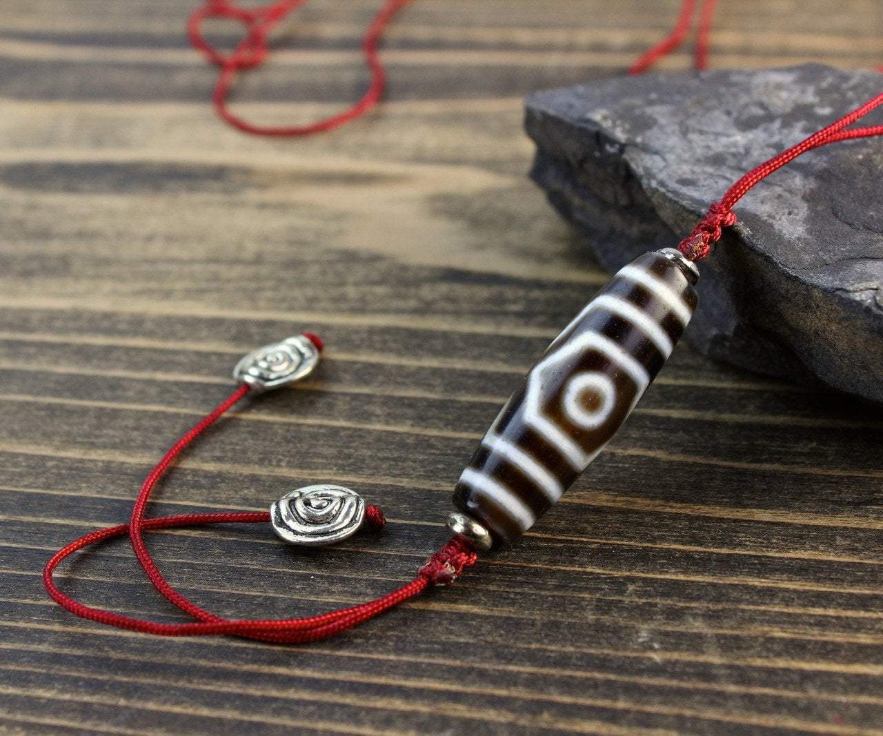 3-eyed dzi bead hung vertically on red cord with hand made silver end beads. A double sliding knot design at the top and bottom of the bead, makes this necklace uniquely adjustable.