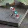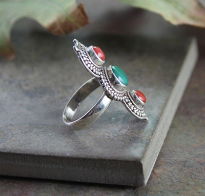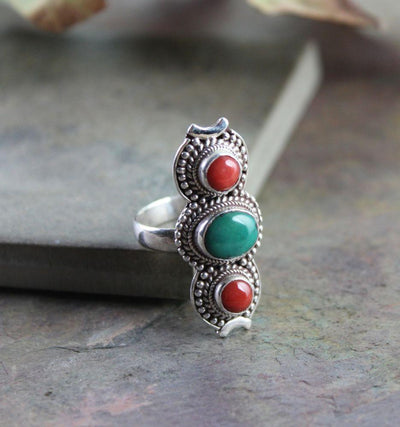 Two coral and one turquoise stone are set in sterling silver and polished to a shine.