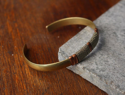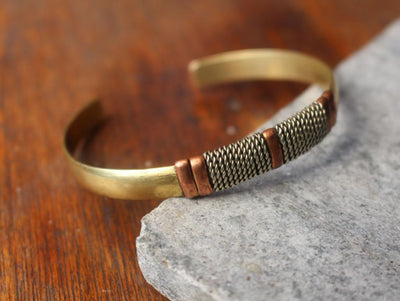 Metal wrapped bracelet hand-crafted in Nepal. Copper and brass. Will adjust to fit most 7-8 inch wrists.