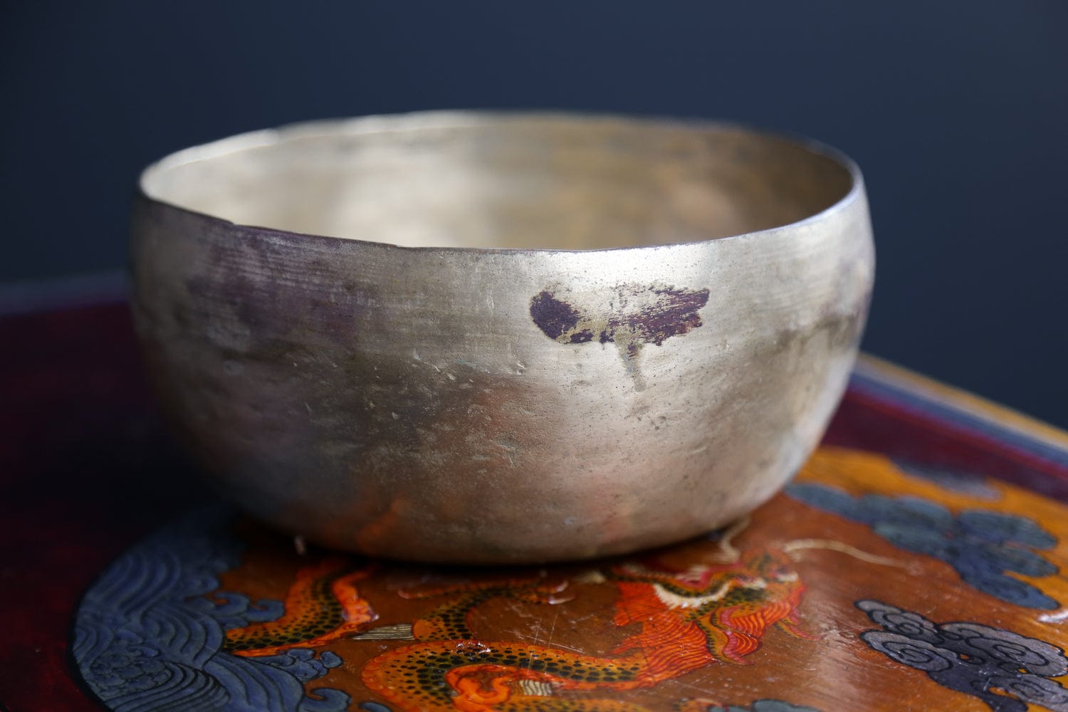 • This is a medium sized, beautifully aged, hand hammered singing bowl with a rounded walls and plenty of natural patina!  Truly a one-of-a-kind bowl with gorgeous signs of age and wear.