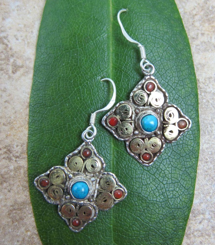 This stylized brass double dorje image is capped with coral stones and centered with a turquoise stone. Set in .925 silver with french wires. Made in Nepal.