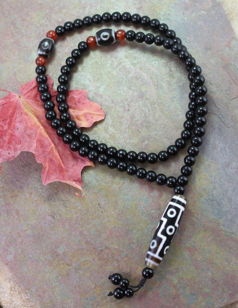 Measures approximately 27 inches around.  9 Eye Dzi bead measures 2 inches in length.  Small agate Dzi beads measure about 12mm.  Black bone beads are 10mm.  Handmade in the shadow of the great stupa of Boudhanath in Kathmandu, Nepal.
