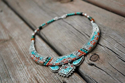 "Bhod" is the Tibetan word for Tibet, and this necklace is a fine example of traditional Tibetan jewelry. Turquoise, coral and silver compliment each other nicely. Handmade in Kathmandu by Tibetan jewelry artist Karma Dolma