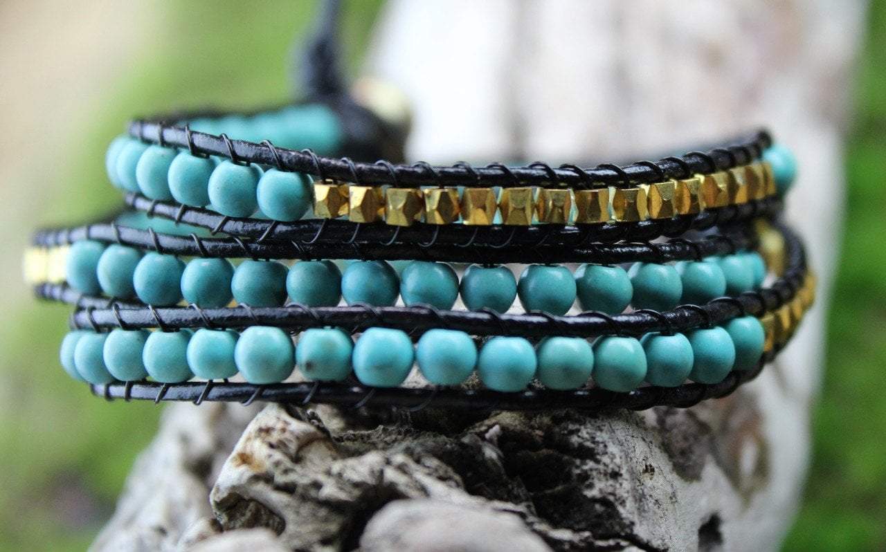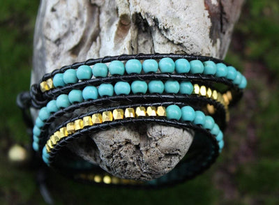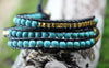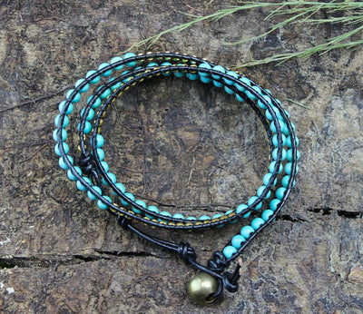 Handmade in India. Handwoven and strung tiny polished brass and turuqoise beads. Wrap bracelet or long necklace.