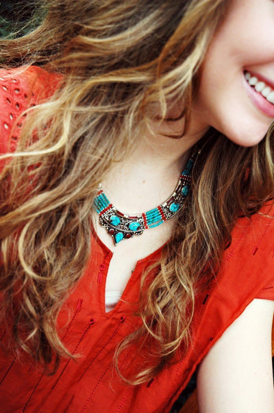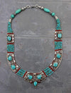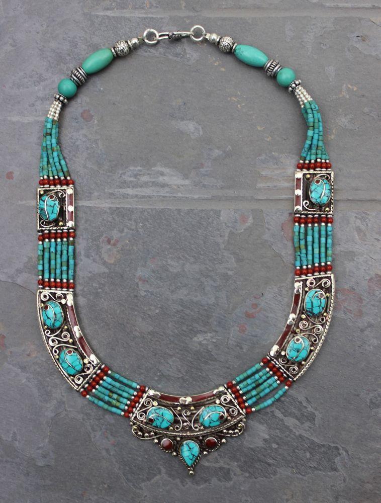 Another beautiful handmade necklace by Karma Dolma in Kathmandu, Nepal. Beautiful turquoise and coral set in silver plated brass Tibetan settings.