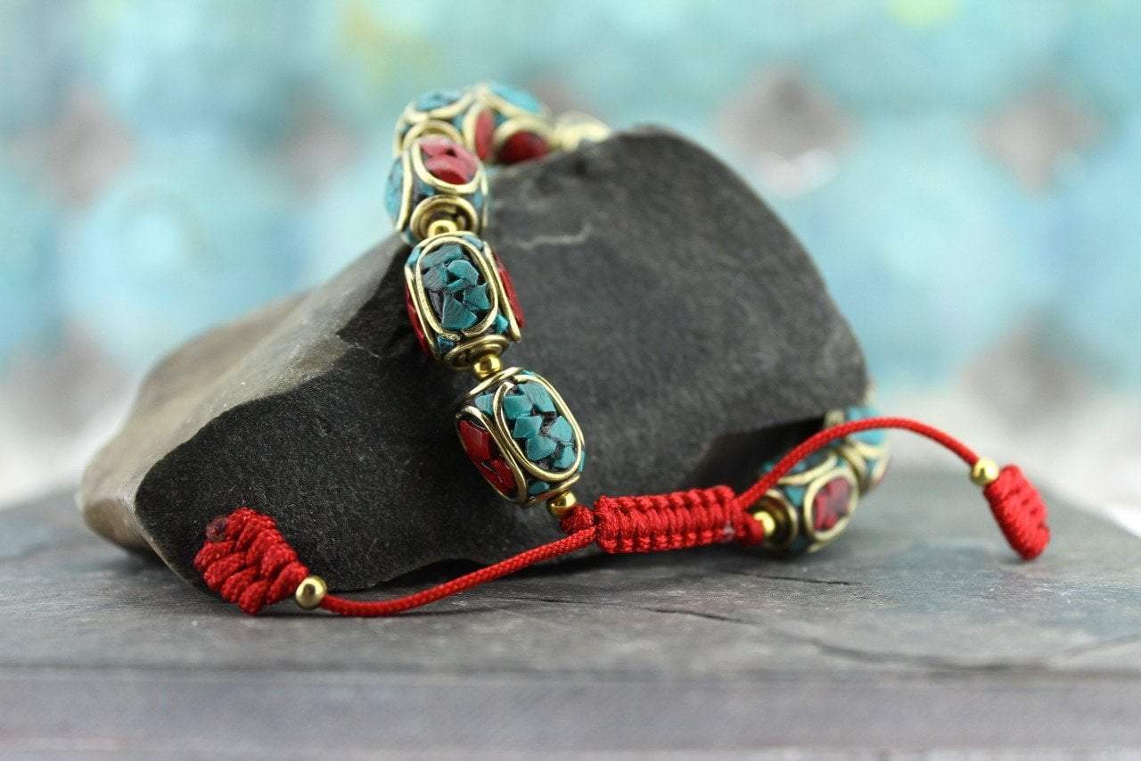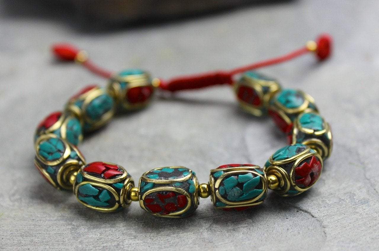 Traditional Tibetan brass, coral and turquoise beads with tiny brass spacers.