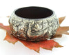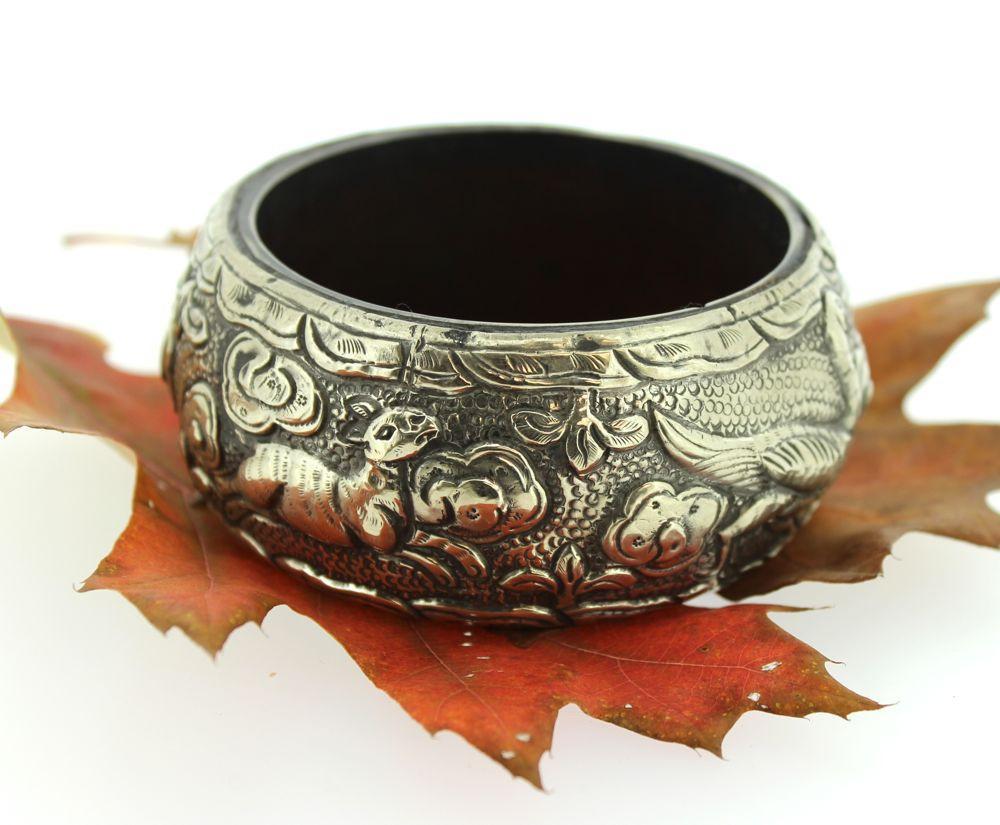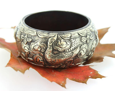 This traditional Tibetan bracelet is a hand carved wooden bracelet with a hand detailed silver wrapping.