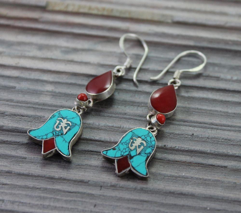 These hand made earrings are delicately inlaid with turquoise and coral stones wrapped in sterling silver. Traditional design. Size:2 inches tall